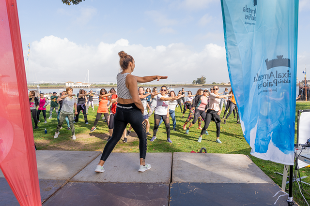 Aulas abertas de zumba, dinamizadas pela professora Sophia Teixeira, no âmbito dos Jogos do Seixal 2025.