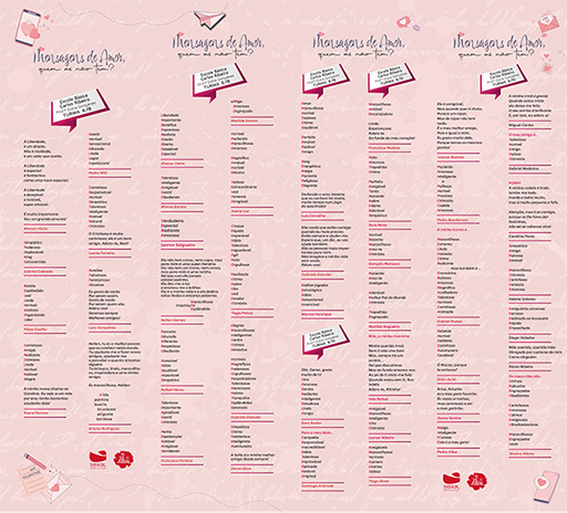 Esta exposição alusiva ao Dia dos Namorados exibe mensagens de amor e trabalhos plásticos concebidos por alunos de escolas dos ensinos básico e secundário do concelho do Seixal e, mais uma vez, integra textos e trabalhos produzidos numa instituição convidada. Nesta edição, contámos com a participação do Centro Paroquial de Bem-Estar Social de Arrentela (CPBESA).