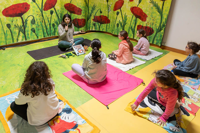 Ioga, mindfullness e inteligência emocional para crianças, em que a dinâmica é inspirada na história de um livro infantil que combina elementos do ioga, movimento e artes plásticas, para promover a literacia emocional.