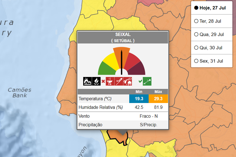 27 Jul '20De acordo com a informação do Instituto Português do Mar e da Atmosfera (IPMA), destaca-se para as próximas 48 horas, um quadro meteorológico de tempo quente e seco e de vento forte, com condições favoráveis à eventual ocorrência e propagação de incêndios rurais.