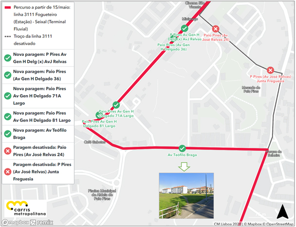 Todas as circulações da linha 3111 passarão a circular pela Av. Teófilo Braga, em alternativa à Rua José Relvas. Assim, deixam de ser servidas as paragens PAIO PIRES (AV JOSÉ RELVAS 24) e PAIO PIRES (AV JOSÉ RELVAS) JUNTA FREGUESIA, na rua José Relvas, passando a estar abrangidas a nova paragem criada na AV. TEÓFILO BRAGA e as paragens PAIO PIRES AV GEN H DELGADO 71A LARGO, P PIRES AV GEN H DELG (X) AV J RELVAS, P PIRES (AV GEN H DELGADO 36) e PAIO PIRES AV GEN H DELGADO 81 LARGO. As restantes paragens são mantidas.