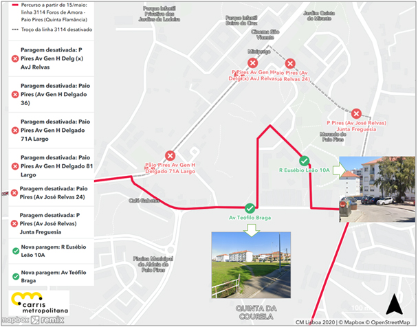 Todas as circulações da linha 3114 passarão a circular pela Av. Teófilo Braga em alternativa à Rua José Relvas. Assim, deixam de ser servidas as paragens PAIO PIRES (AV JOSÉ RELVAS 24), PAIO PIRES (AV JOSÉ RELVAS) JUNTA FREGUESIA, PAIO PIRES AV GEN H DELGADO 71A LARGO, P PIRES AV GEN H DELG (X) AV J RELVAS, P PIRES (AV GEN H DELGADO 36) e PAIO PIRES AV GEN H DELGADO 81 LARGO. São criadas novas paragem na AV. TEÓFILO BRAGA e na RUA EUSÉBIO LEÃO 10A. As restantes paragens são mantidas.