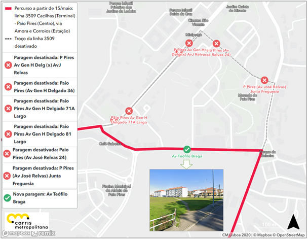 Todas as circulações da linha 3509 passarão a circular pela Av. Teófilo Braga em alternativa à Rua José Relvas. Assim, deixam de ser servidas as paragens PAIO PIRES (AV JOSÉ RELVAS 24), PAIO PIRES (AV JOSÉ RELVAS) JUNTA FREGUESIA, PAIO PIRES AV GEN H DELGADO 71A LARGO, P PIRES AV GEN H DELG (X) AV J RELVAS, P PIRES (AV GEN H DELGADO 36) e PAIO PIRES AV GEN H DELGADO 81 LARGO. É criada uma nova paragem na AV. TEÓFILO BRAGA. As restantes paragens são mantidas.
