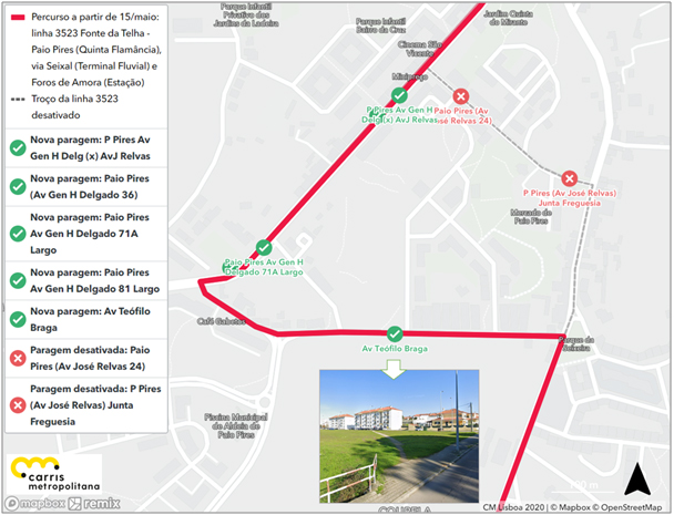 Todas as circulações da linha 3523 passarão a circular pela Av. Teófilo Braga em alternativa à Rua José Relvas. Assim, deixam de ser servidas as paragens PAIO PIRES (AV JOSÉ RELVAS 24) e PAIO PIRES (AV JOSÉ RELVAS) JUNTA FREGUESIA, na rua José Relvas, passando a estar abrangidas a nova paragem criada na AV. TEÓFILO BRAGA e as paragens PAIO PIRES AV GEN H DELGADO 71A LARGO, P PIRES AV GEN H DELG (X) AV J RELVAS, P PIRES (AV GEN H DELGADO 36) e PAIO PIRES AV GEN H DELGADO 81 LARGO. As restantes paragens são mantidas.