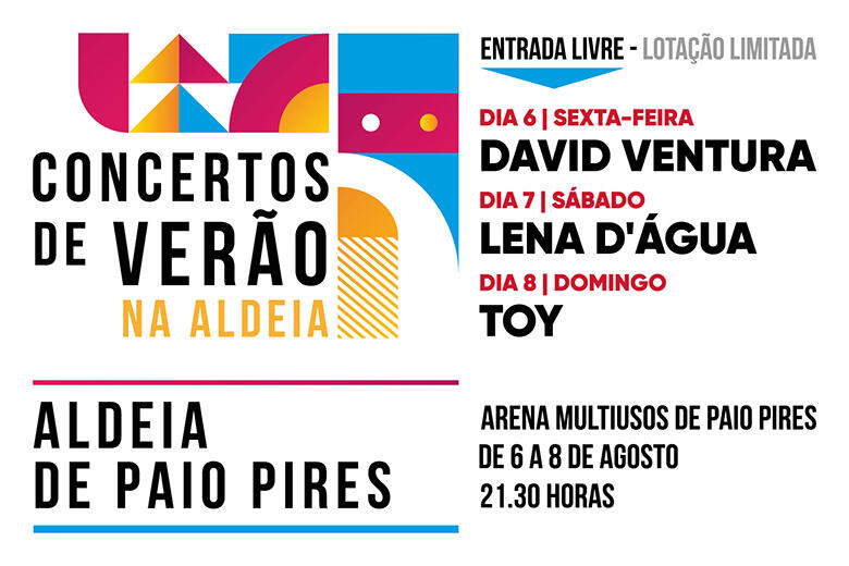 A Arena Multiusos de Paio Pires vai ser palco dos Concertos de Verão na Aldeia. Serão três noites muito especiais, com as atuações de David Ventura, na sexta-feira, dia 6 de agosto, Lena d’Água, no sábado, dia 7, e Toy, no domingo, dia 8. Os concertos iniciam-se sempre às 21.30 horas.