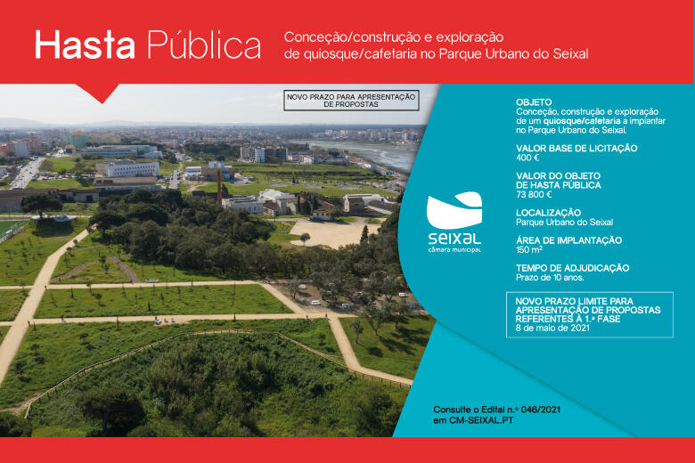 A deliberação da Câmara Municipal do Seixal n.º 041/2021-CMS, de 24 de fevereiro, procedeu à prorrogação do prazo para apresentação de propostas relativas à hasta pública para conceção/construção e exploração do quiosque/cafeteria a implantar no Parque Urbano do Seixal, de acordo com o respetivo regulamento.