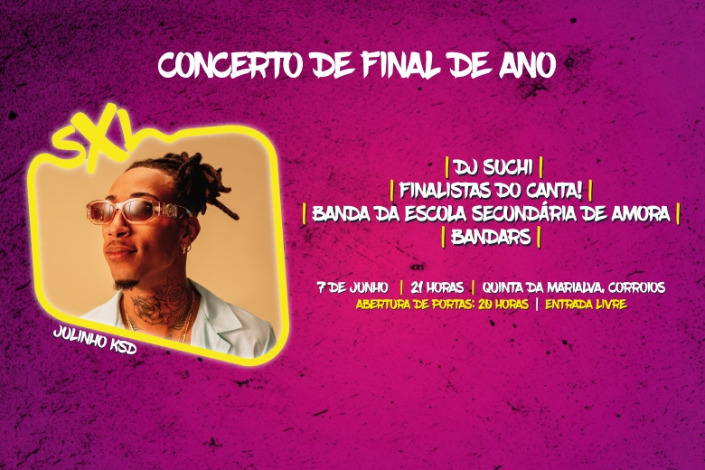 O jovem rapper Julinho Ksd é o grande destaque para assinalar o final deste ano letivo, com um espetáculo no dia 7 de junho, na Quinta da Marialva, em Corroios, e que a partir das 21 horas juntará em palco o DJ Suchi, os finalistas do Canta!, e as bandas das escolas secundárias de Amora e Alfredo dos Reis Silveira. A entrada é livre.