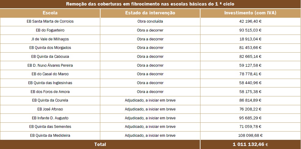 Apesar das coberturas em fibrocimento apenas serem prejudiciais para a saúde quando danificadas, o que não se verificava, a autarquia está a substituí-las nas escolas do 1.º ciclo com um objetivo preventivo. A autarquia também reivindica ao Governo a remoção do fibrocimento existente nas escolas básicas dos 2.º e 3.º ciclos e secundárias, que são da sua responsabilidade.
